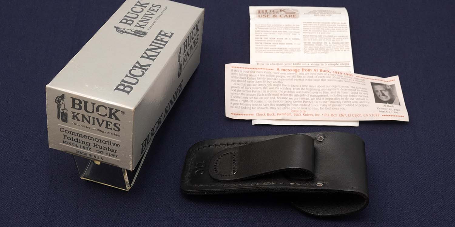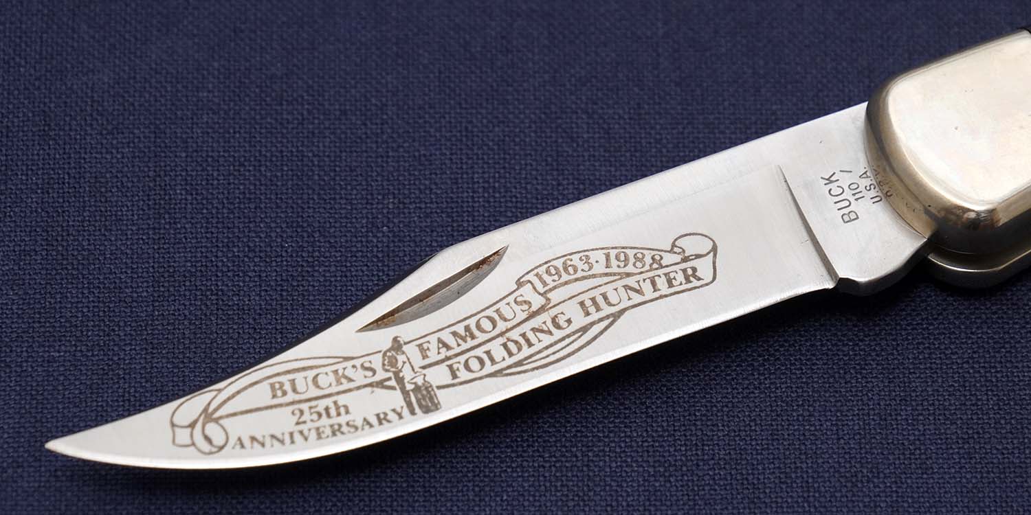 ナイフの代名詞とさえ表現される#110の生産25周年(1963〜1988)を記念して作られた限定モデル。その後もブレイドにエッティングを施した記念モデルはいくつも登場したが、ブレイド全面エッティングのこのモデルは他とは格が異なり珍しい。パッケージもシルバーBOXはこの限定モデル以外には使っていないと思われる。メイカーにとっても記念にすべき限定品だったのでしょう。BUCK社はカリフォルニアの有名な軍港サンジェゴに工場があったが約10年以上前にカナダ国境と接する辺境の地に移転した。