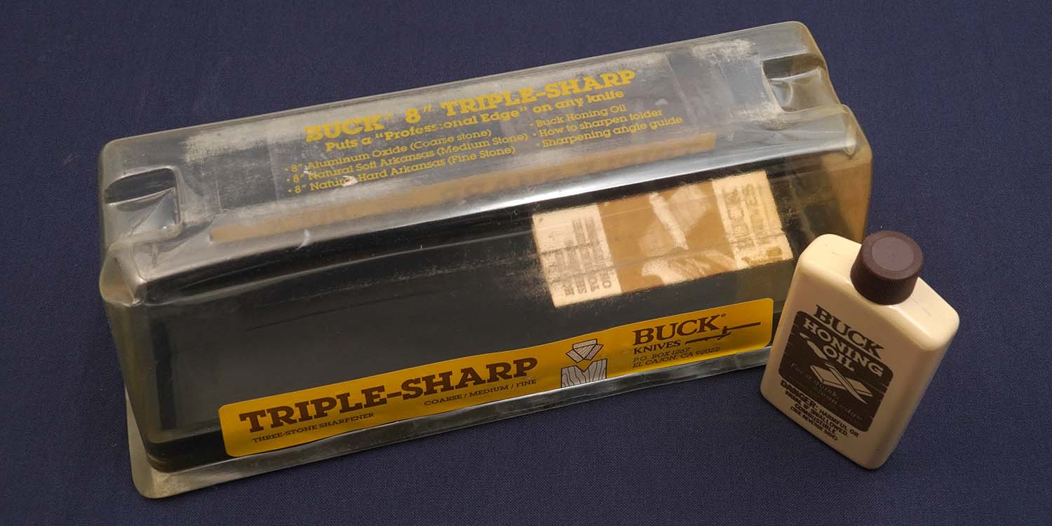 1970年代製。3種類の砥石が木製台に付いた トリプル シャープニングストーンです。オールド時代の雰囲気の良さがよく出ており貴重品です。オイルは既に劣化しているだろう、コレクションアイテム。