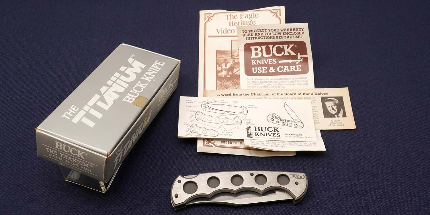 デザイン・サイズ共、110同様に作られたチタニウムハンドルのモデル。1987年に一世を風靡した貴重なモデルです。ブレードプロテクター・ベルトクリップパーツ・取り外し工具・予備のネジ付属、説明書がオリジナル箱に入っています。