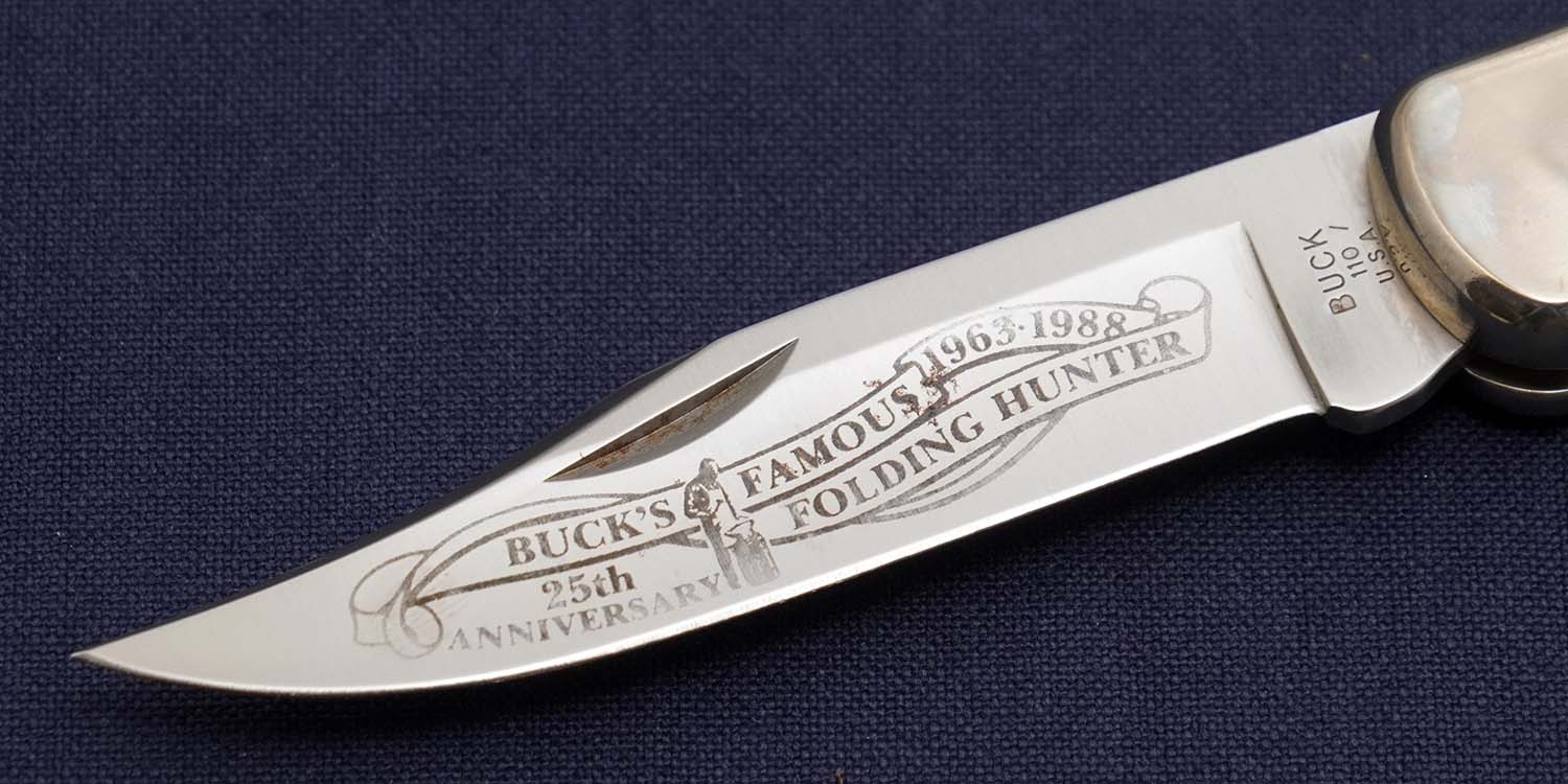 ナイフの代名詞とさえ表現される#110の生産25周年(1963〜1988)を記念して作られた限定モデル。その後もブレイドにエッティングを施した記念モデルはいくつも登場したが、ブレイド全面エッティングのこのモデルは他とは格が異なり珍しい。パッケージもシルバーBOXはこの限定モデル以外には使っていないと思われる。メイカーにとっても記念にすべき限定品だったのでしょう。BUCK社はカリフォルニアの有名な軍港サンジェゴに工場があったが約10年以上前にカナダ国境と接する辺境の地に移転した。