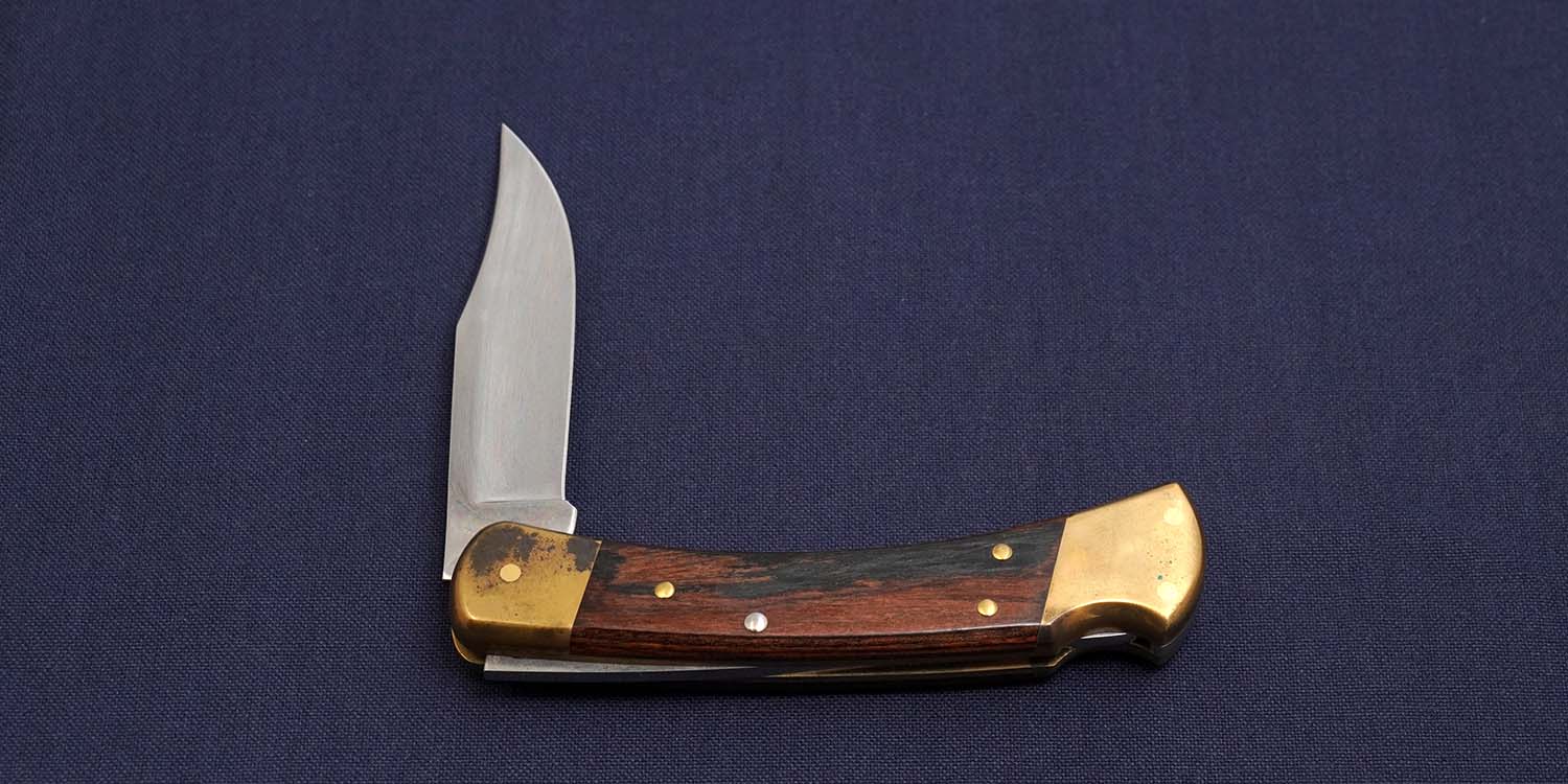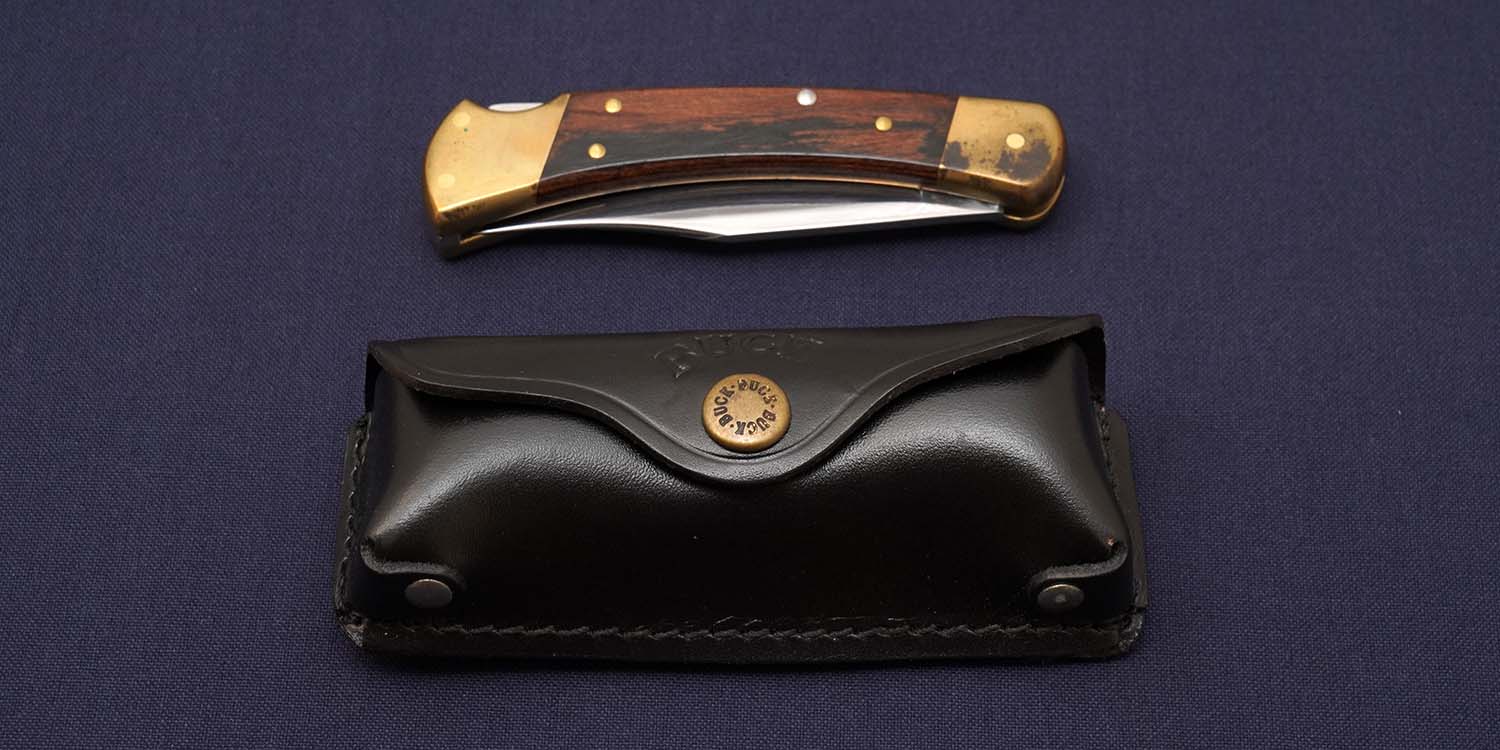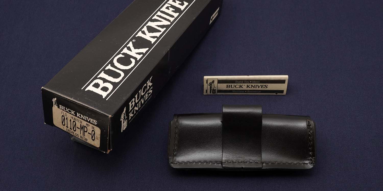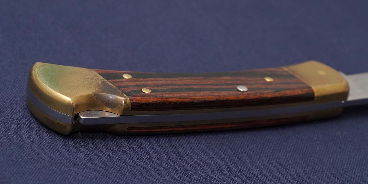 ベベルストップからポイントへの優しいラインは現存のマシンでは作れないのか職人のレベルから言って無理なのか暖かさを感じさせるラインです。ベルトシースは珍しい横タイプのオリジナルモデルでバック社の110MPに対する意気込みを感じさせる。美しいマッカーサーエボニーハンドルを固定するピンがリミテッドモデルだけに特徴がある。4本の内、中央のピンはステンレスだが、他の3本はブラスボルスターに合わせてゴールドのブラスを使用、こだわりを感じる一品です。2000年代に入り、Buck社が原産国不明のナイフを大量に生産したため再評価されています。