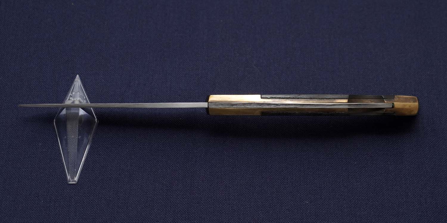 リカッソ斜めのオールドタイプ。砥ぎ直しされた中古品です。この掲載品は、ハンドルにインレイされたウッドに厚みがあり後部はステンレスではなくブラスで塞いでいます(6番目の写真)。ハンドル全体が角張った造りのより古い時代のものと思われます。