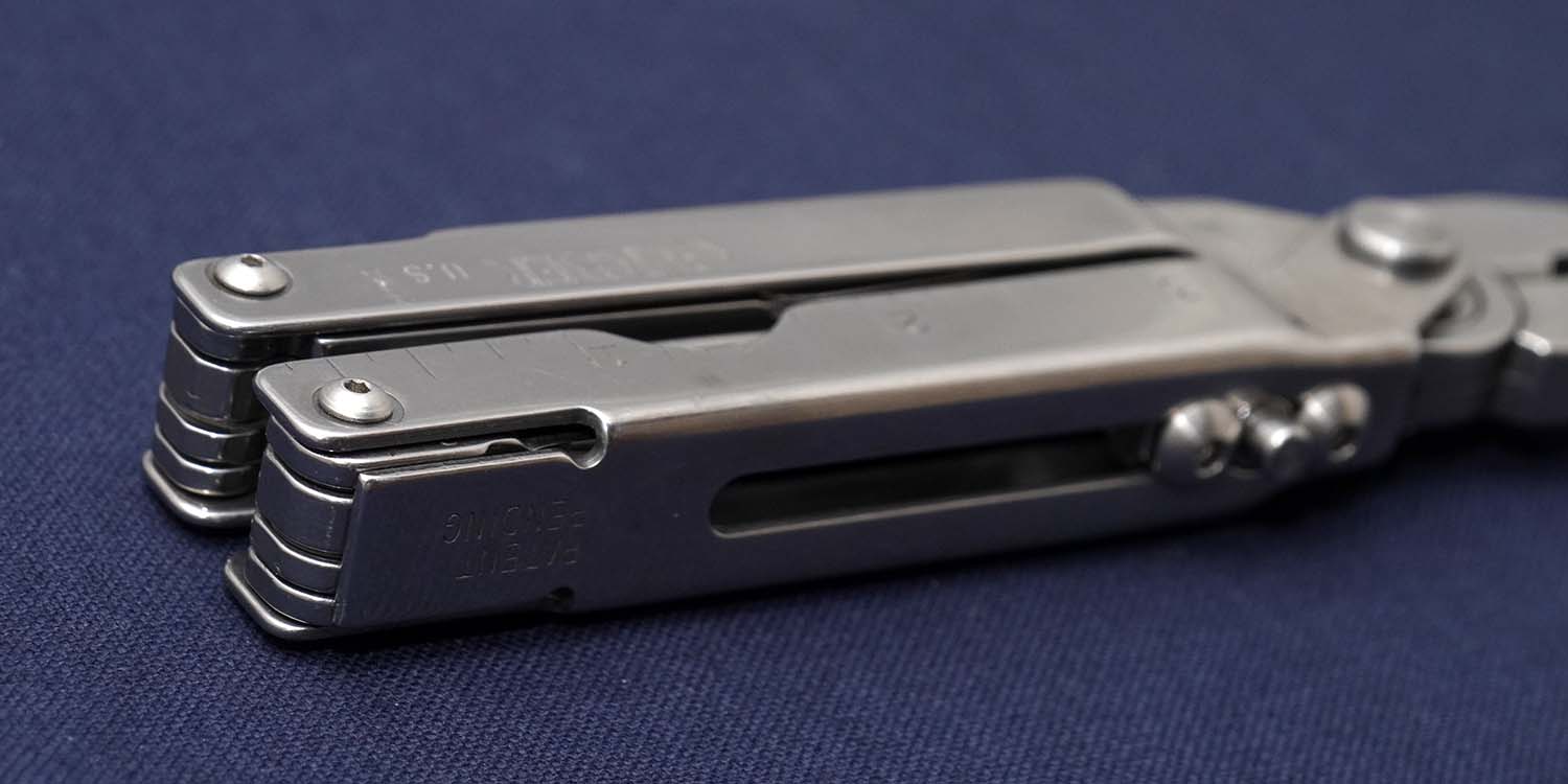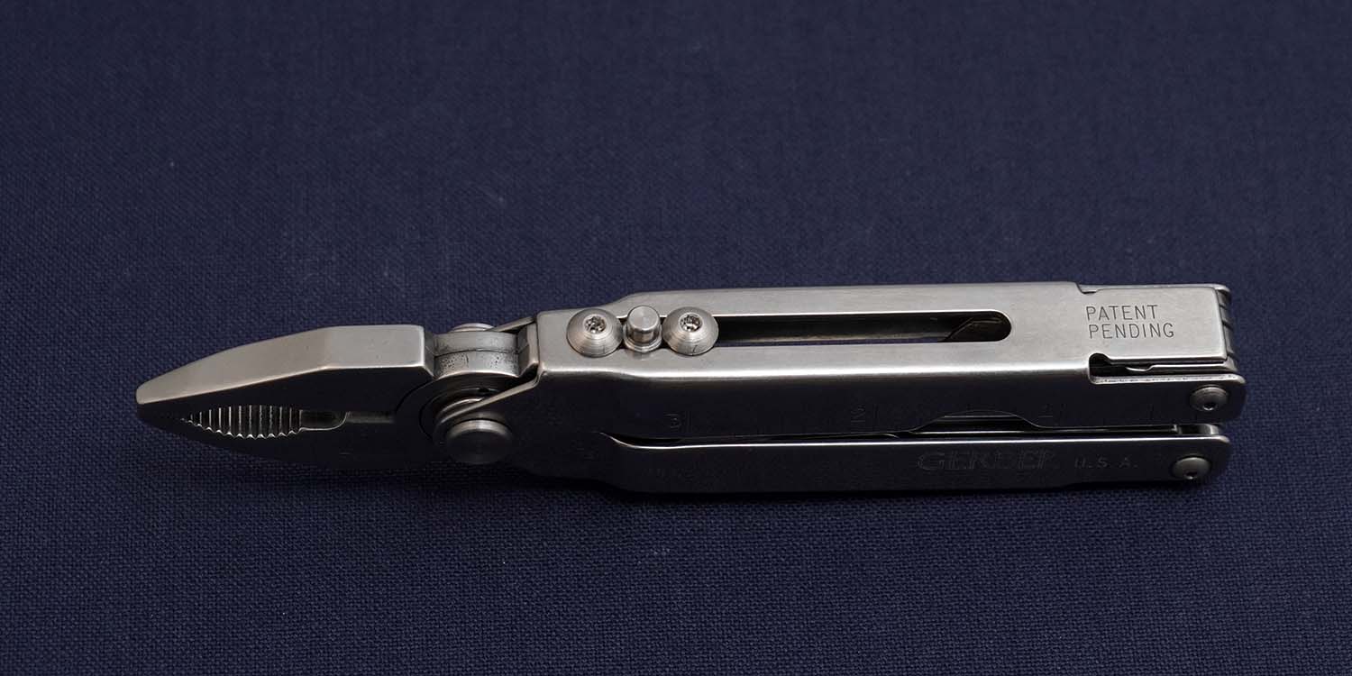 ハンドルの両サイドにあるボタンを押し、スライドするだけでプライヤーヘッドを出せる画期的ツール。ボディはマット仕上げではなく光沢があるタイプです。昔はハサミ付きがありました、今では目にすることのない貴重なモデルです。