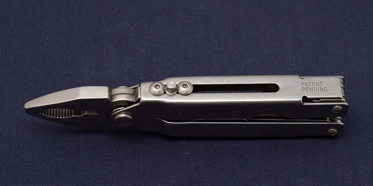 ハンドルの両サイドにあるボタンを押し、スライドするだけでプライヤーヘッドを出せる画期的ツール。ボディはマット仕上げではなく光沢があるタイプです。昔はハサミ付きがありました、今では目にすることのない貴重なモデルです。