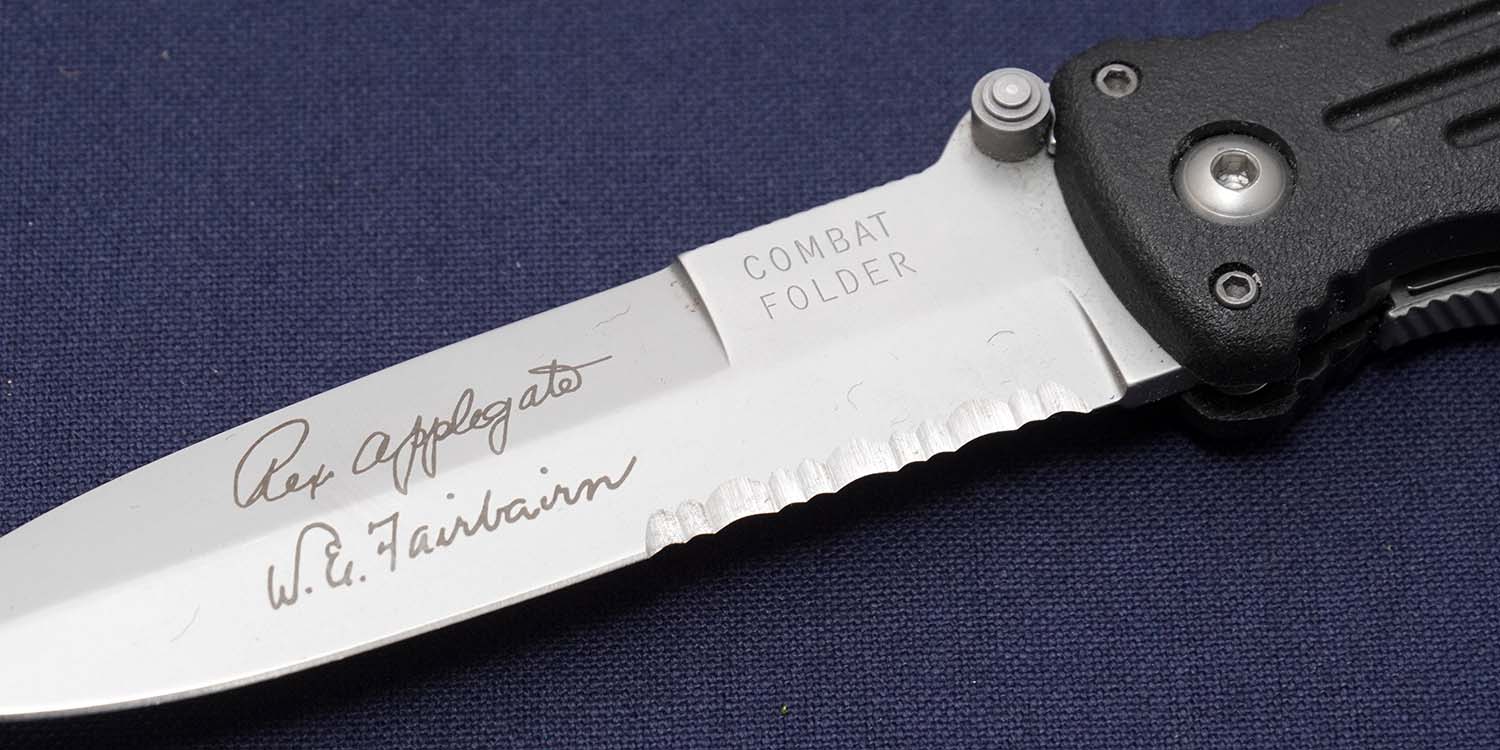 今は亡きレックス・アップルゲイト大佐が豊富な戦場経験から開発した世界初の折りタタミ式のコンバットナイフです。ブレイドが完全にハンドル内に収納される構造は当時のGERBERの技術の高さに驚かされたものです。写真は初期モデルのガンフォルダー型の非常に珍しいシースです。2010〜2012年にかけてこの人気モデルはナイフのデザインは同じ?で木台付、木箱入などが再生・復刻されたがオリジナルの初期モデルはこれのみ。Made in U.S.A. 元々ブレイド上部に刃付けはなし、ダガーナイフではありません。