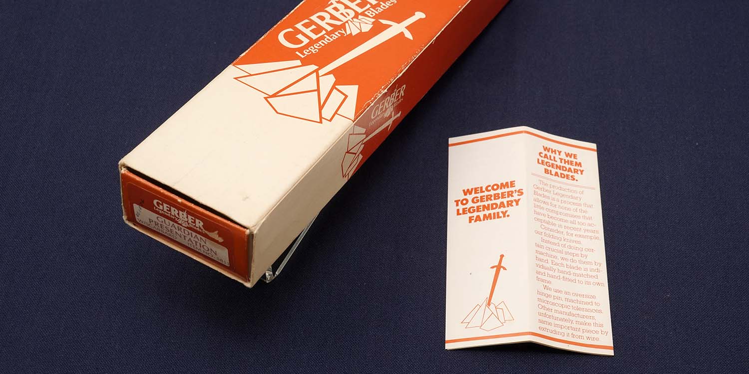 1980年代前半の生産品です。 1981年のパンフレットが入っています。ダブルエッジは、2009年(H21)の法施行前に国内メイカーの協力を得て修正適法化後、倉庫に長期眠っていましたが、今回紹介することにしました。上部と下部先端に刃付けなし修正しています。