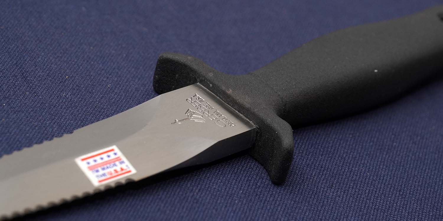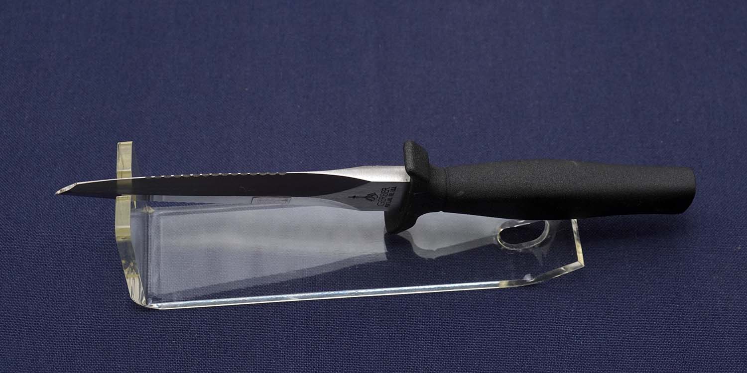 | ブレイド | 440C 116mm (エッジ部:21mm+セレイション部:47mm) シリアルNo.入り 上部と下部先端に刃付けなし修正済 ポイント付近に小傷あり |