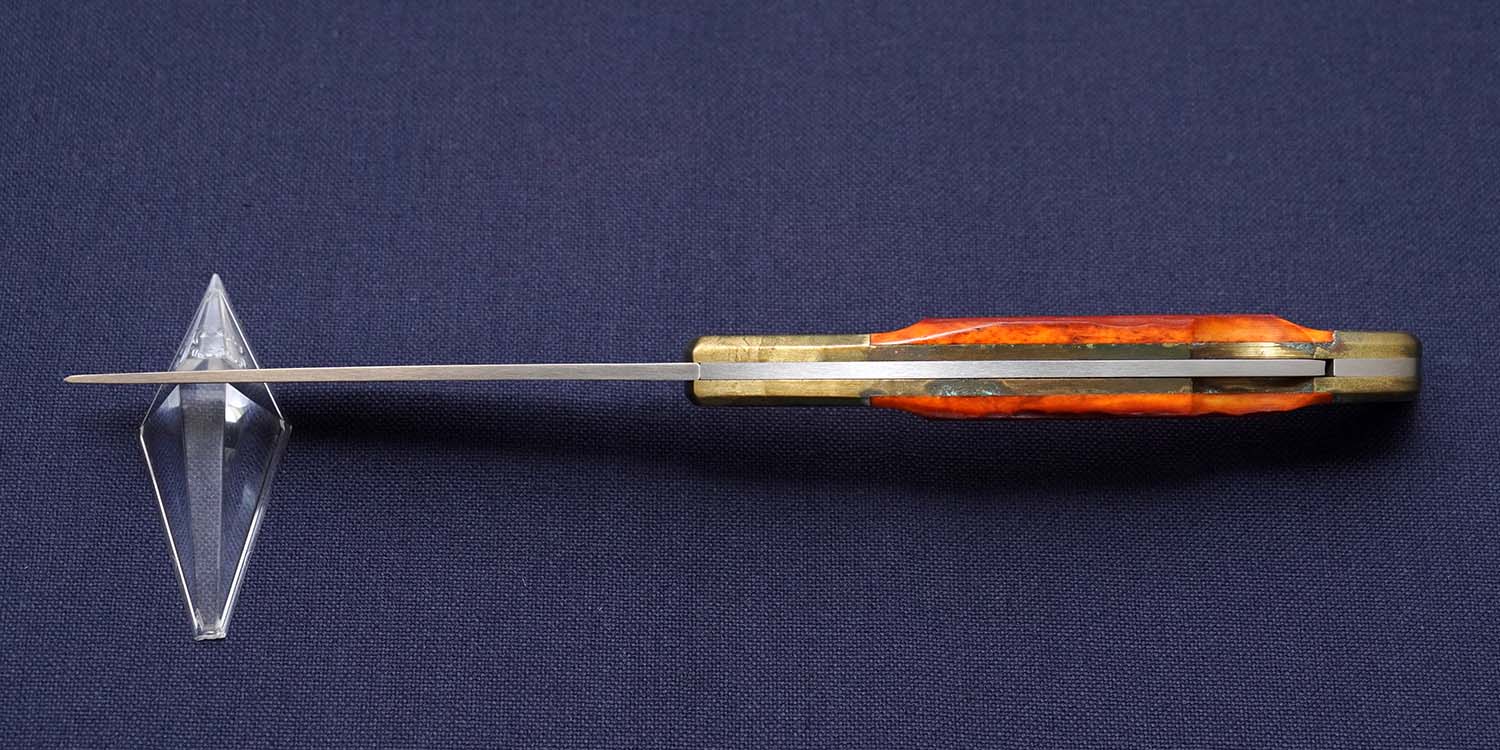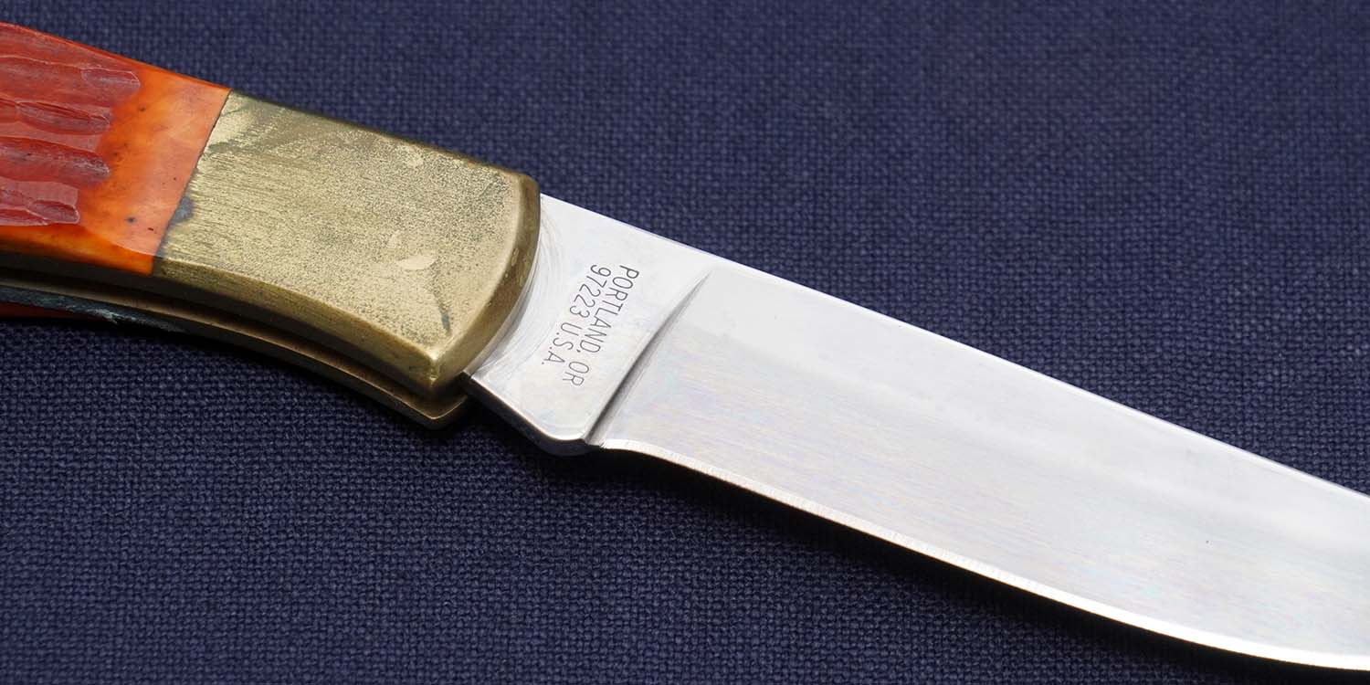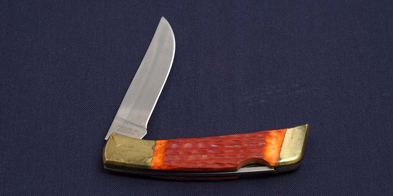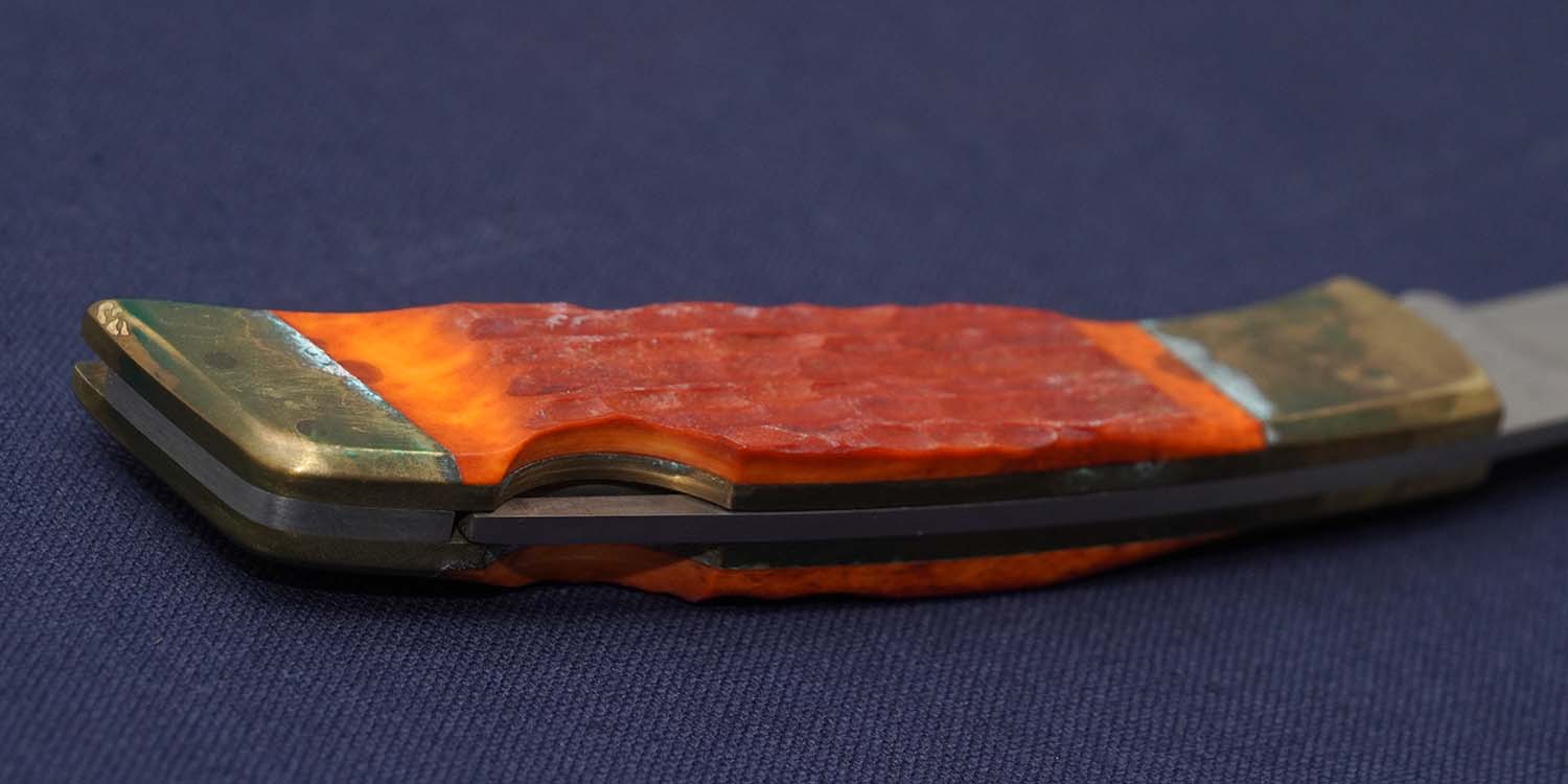 | ハンドル | レッドジグドボーン(腐食少量あり) ボルスター:ブラス(緑青拭き取り済み)110mm 全長202mm 在庫すべてに経年変化によるブラス特有の変色あり |