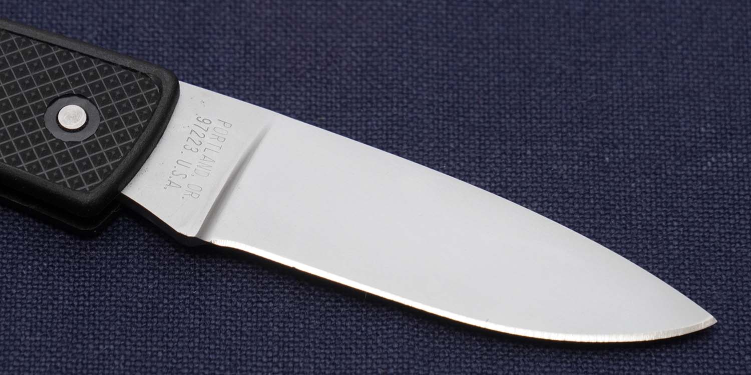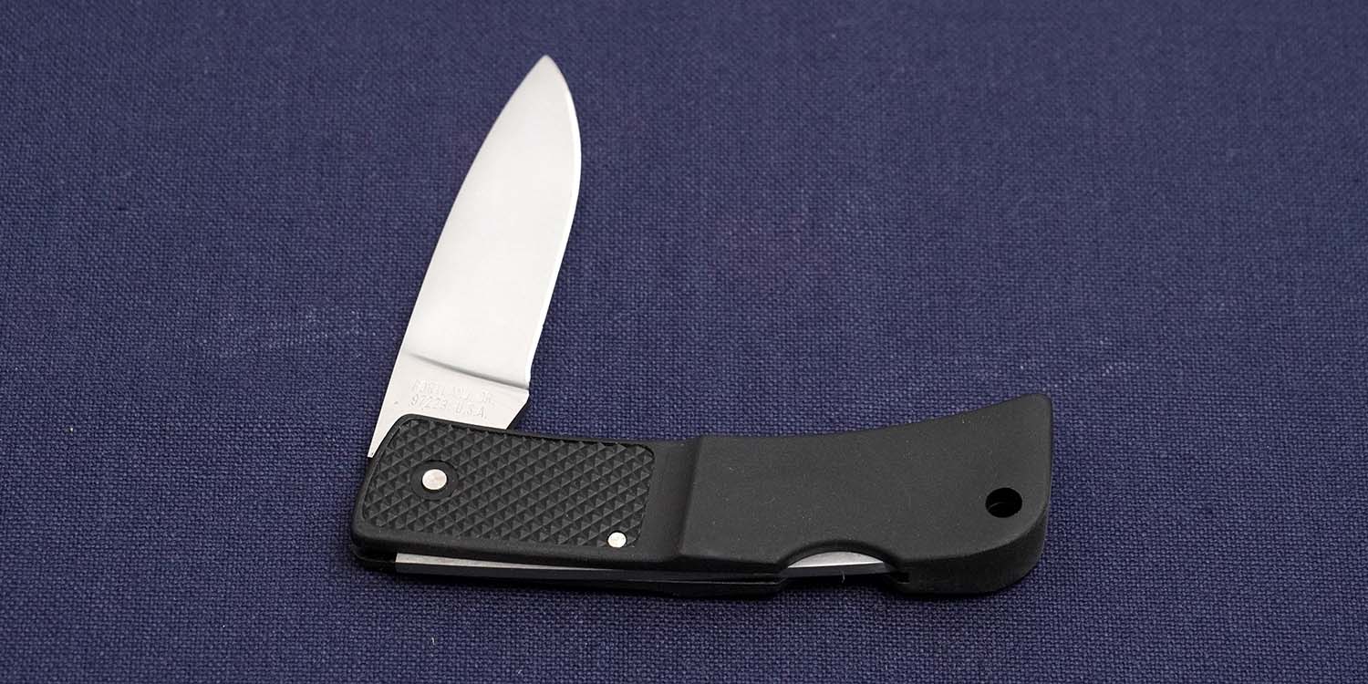 LSTシリーズのナイフには、ブレイドが一気に閉じないように途中の箇所にストッパーが設けられています。二段階で折りたたむ構造になっており、より安全に操作できます。昔はネイルマークが設けられていましたね。スライド式赤箱入りです。