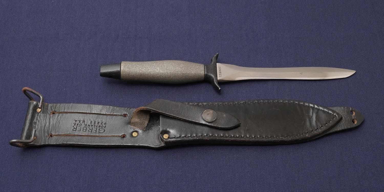 製造年がわかるようにシリアルNo.が刻印されています。この Mark Uは、1967年代後半〜1968年代前半の製造品だと思われます。GERBERロゴは初代斜めロゴ(剣軸が斜め)、セレーションのない細くしたブレイドが特徴です。シリアルNo.側にわずかに傾斜しています。ハンドルは、ざらざらしたキャッツタング。コレクターさんには究極の1本となるでしょう。