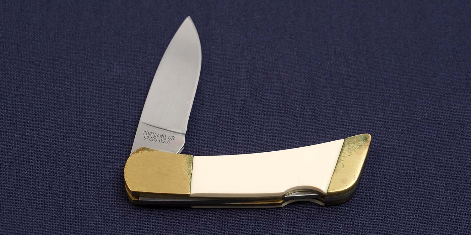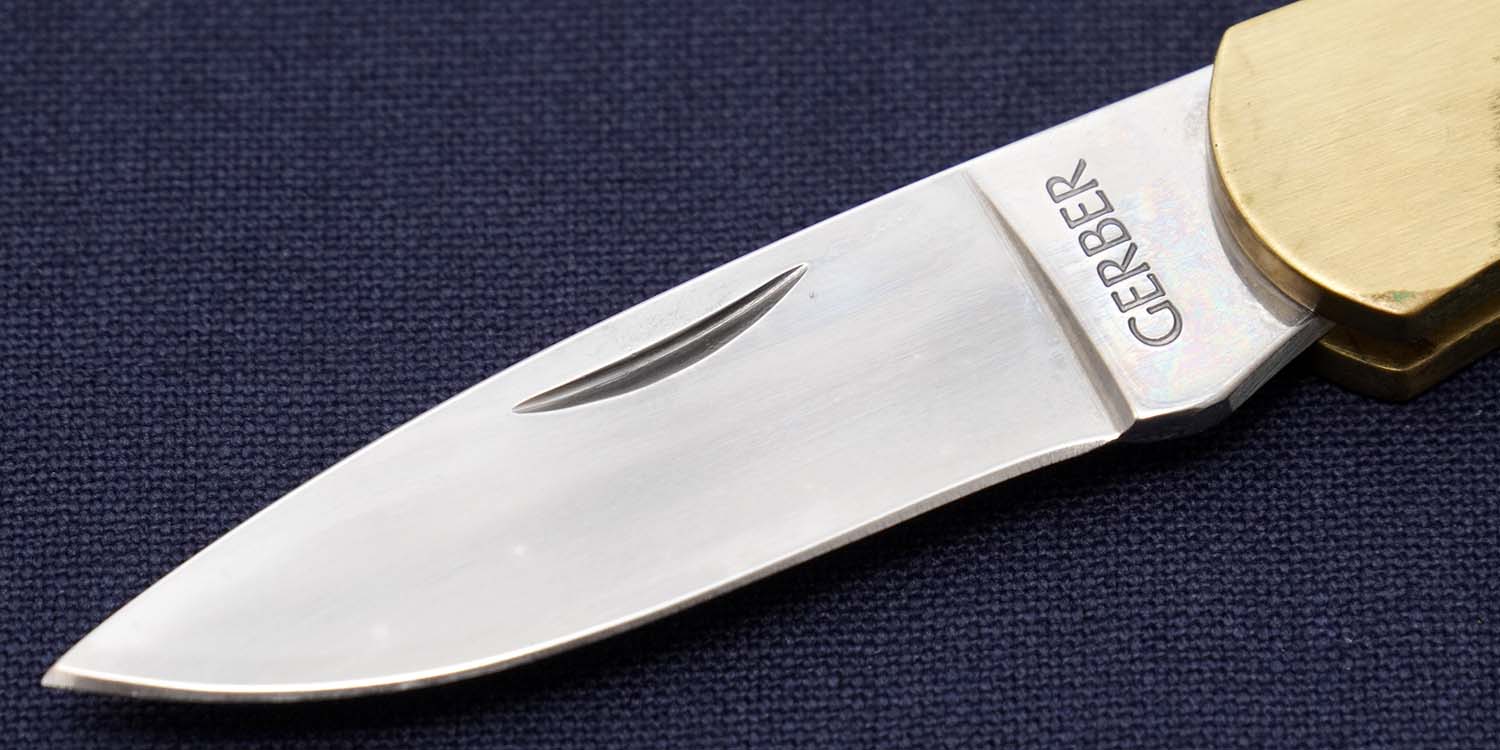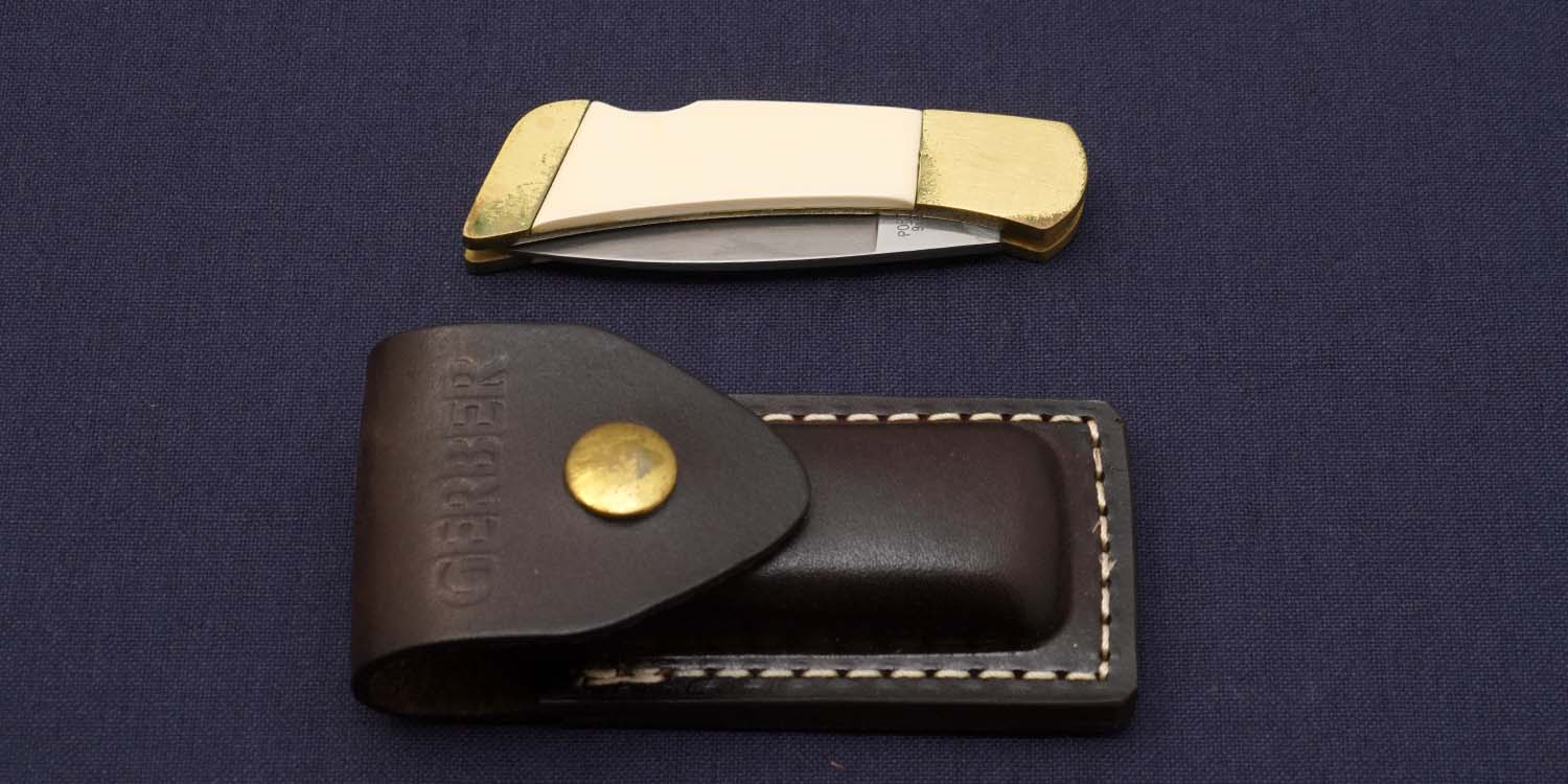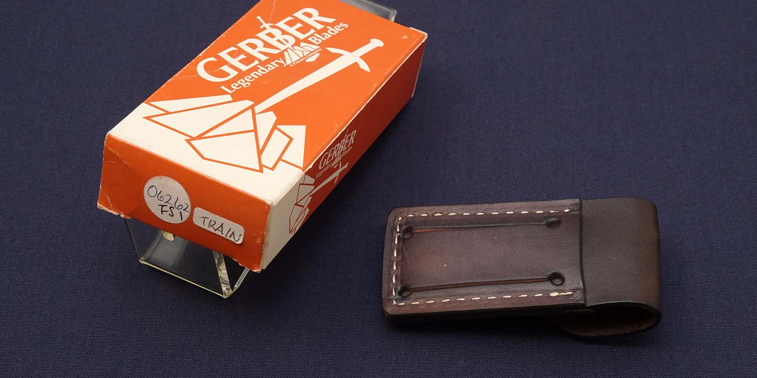 ガーバーが独自で開発したスクリムショウは極めて繊細な毛彫り技術でした。当初は失敗も多く、毛彫りを中止してプリントにする事もテストした様ですが、プリントと毛彫り(スクリム)では繊細さが全く異なるのである程度量産できるまで非常に苦労した様です。1987年頃の生産品。レザーシースは底辺が四角いオールドタイプです。