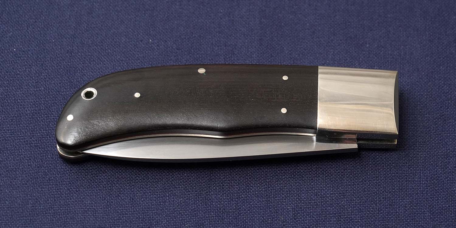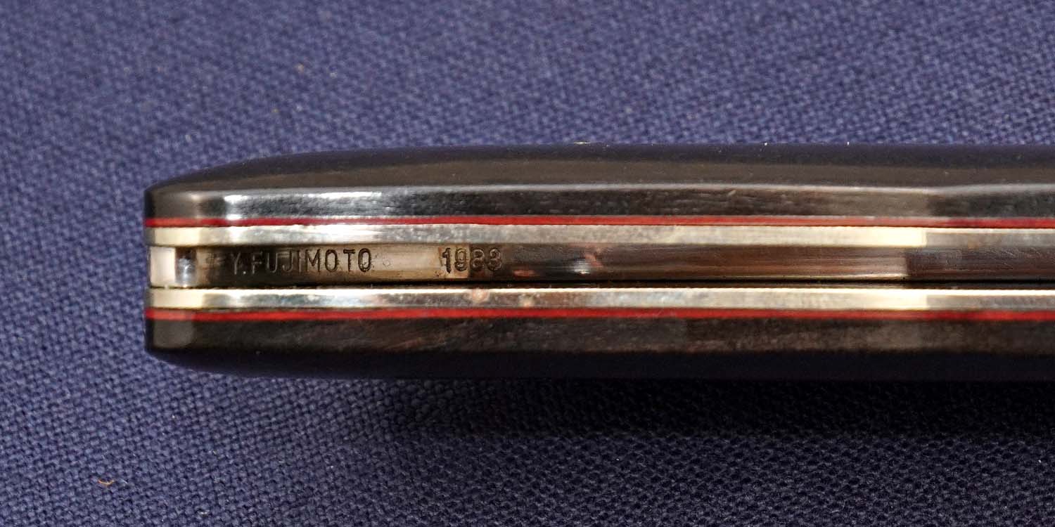 | ハンドル | ウッド /ボルスター:ニッケルシルバー/レッドスペーサー/ハンドル内にY.FUJIMOTO1983刻印(製作年次) 113mm 全長203mm サイドロックボタンとボルスターに細かい擦れ傷あり |