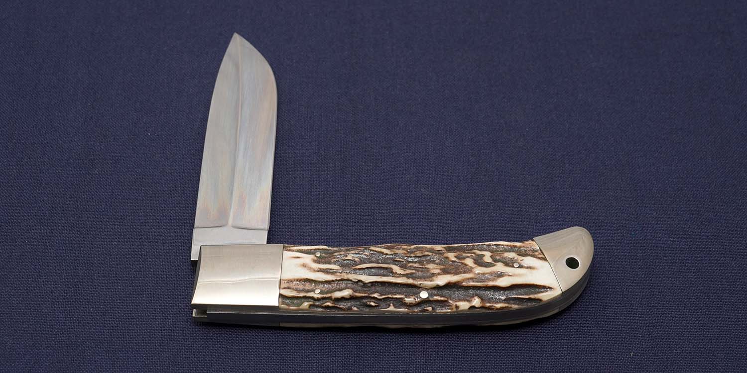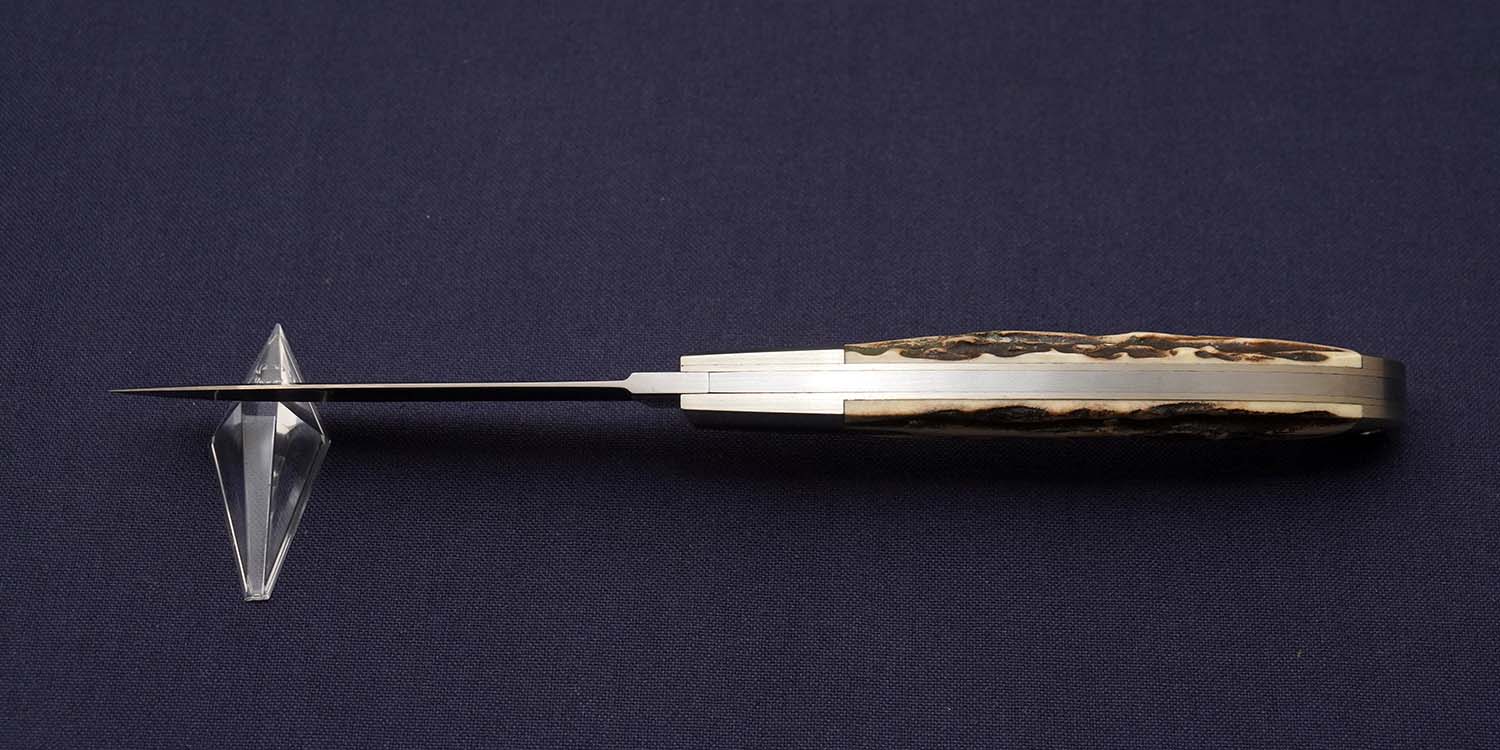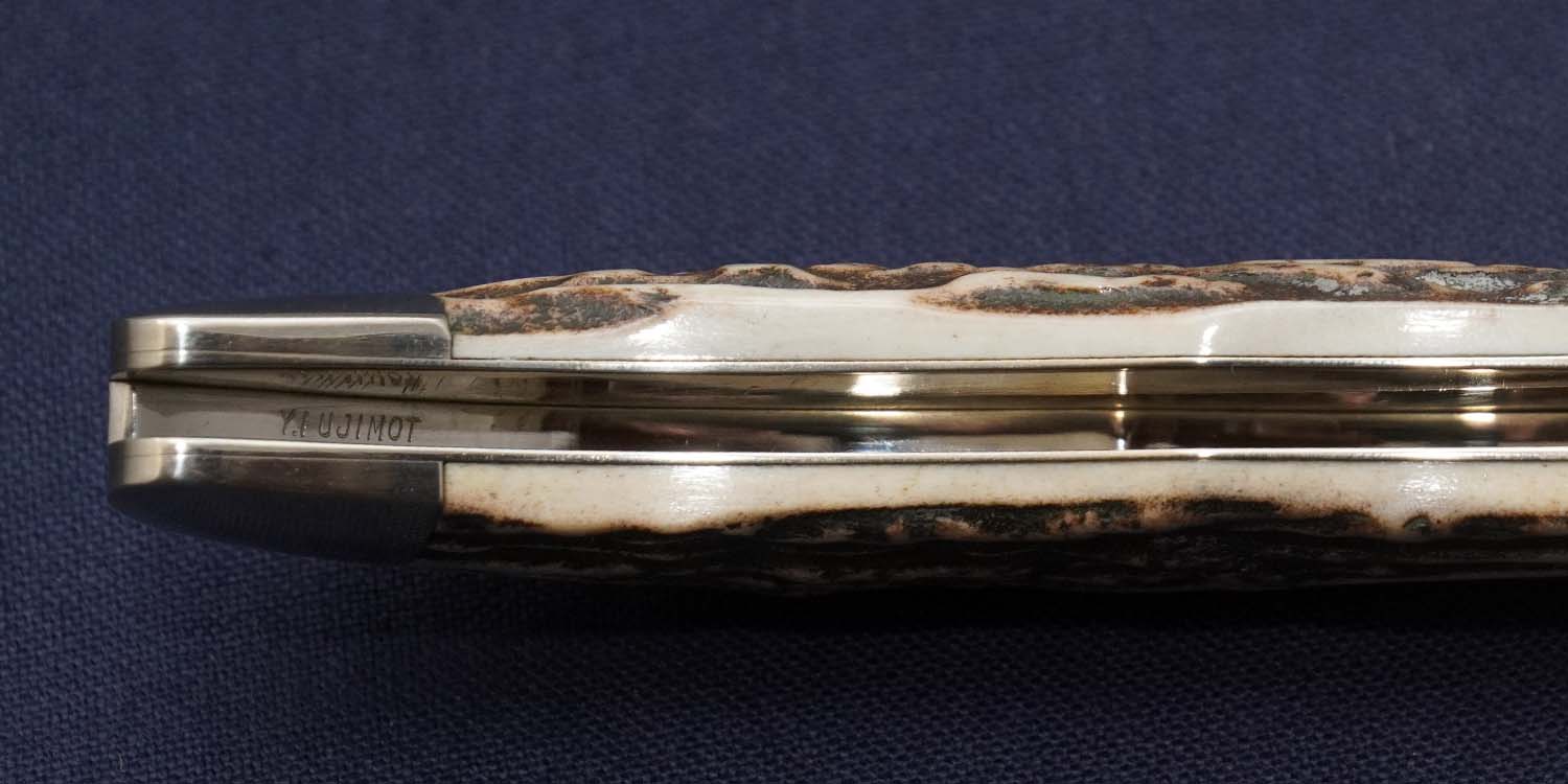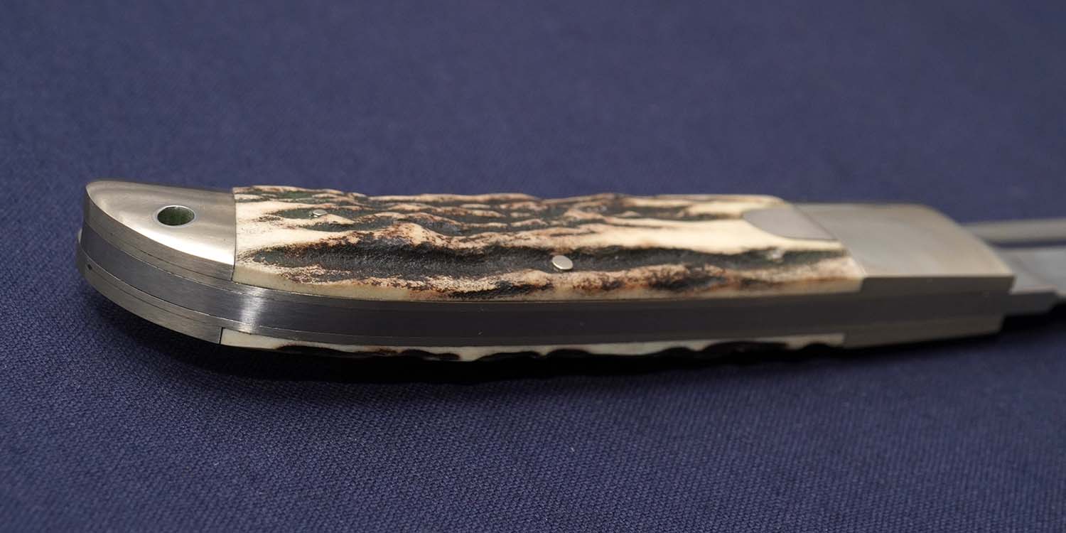 | ハンドル | サンバースタッグ/ボルスター&エンドボルスター:ニッケルシルバー/ハンドル内部にY.FUJIMOTO刻印入り 137mm 全長245mm サイドロックボタンとボルスターに細かい擦れ傷あり |