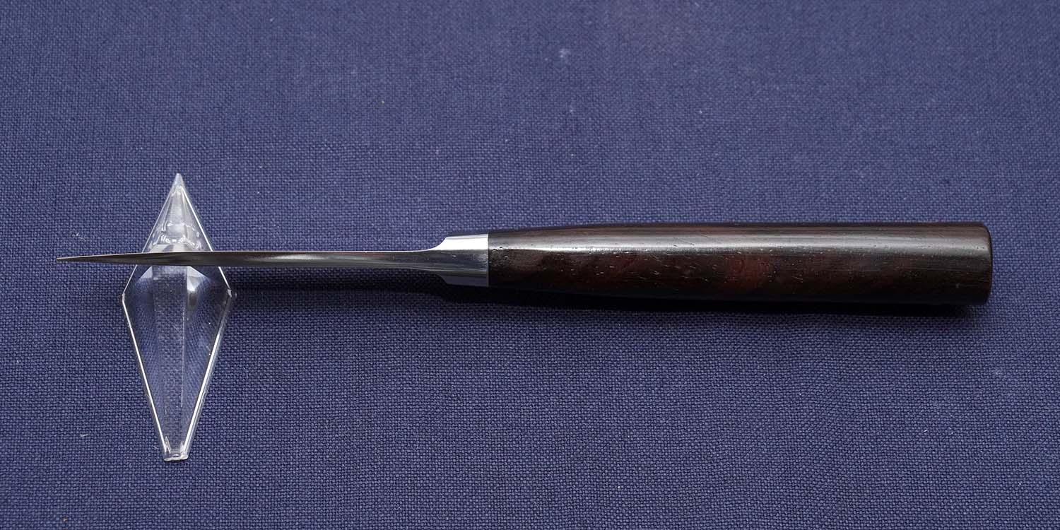 「ピッケル作りの名人」「幻のピッケル作り」と高い評価を受けている二村善市、火造り鍛造 一体構造のフルインテグラルナイフを製作。火造り加工の難しさから、出来ないと言われていた鋼材のATS‐34を鍛造、1980年〜90年代にかけてATS-34を鍛造してミラー仕上げを完成したのは二村善市氏が唯一であった。