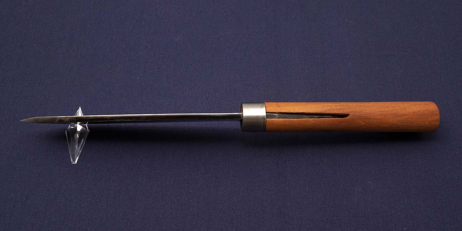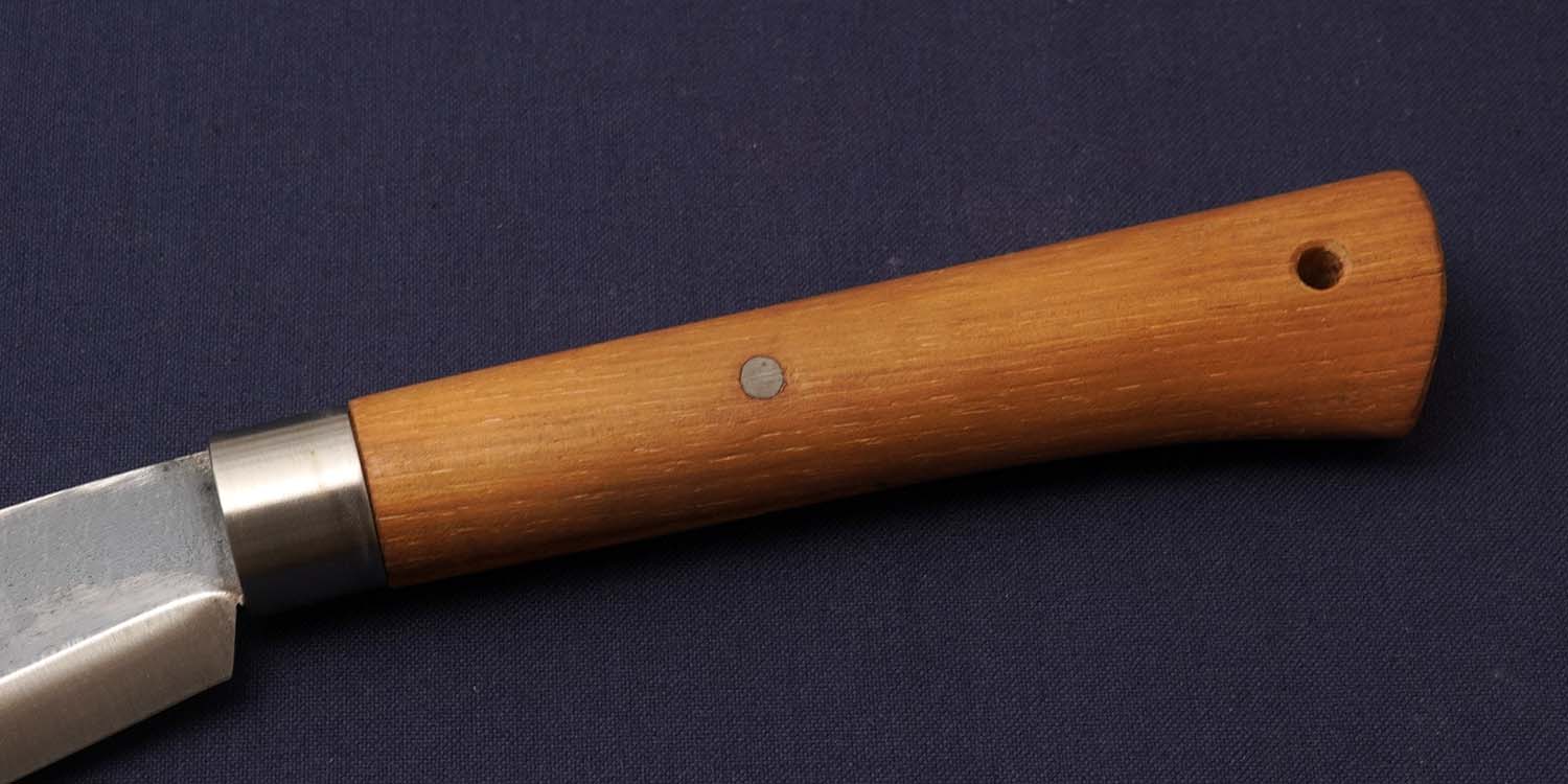 「ピッケル作りの名人」「幻のピッケル作り」と高い評価を受けている二村善市作剣鉈、素晴らしい名剣とさえいえる砥ぎ。ハンドル材は、粘り強いカリフォルニア産のヒッコリーを使用している。使用(実用)機会の多かった剣鉈は意外と残存していないでしょう。