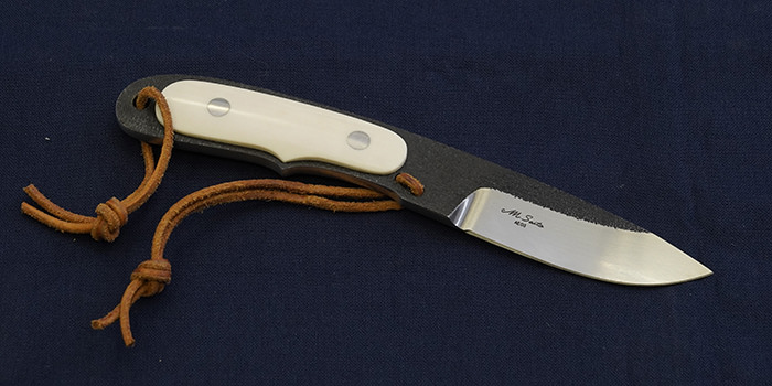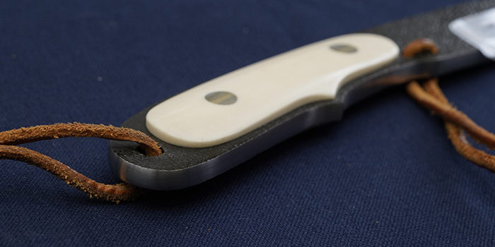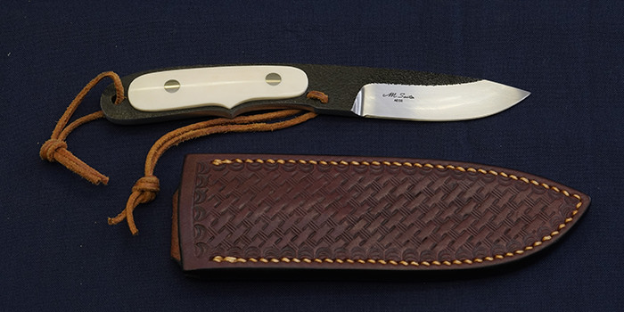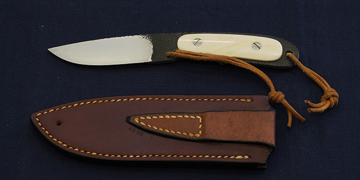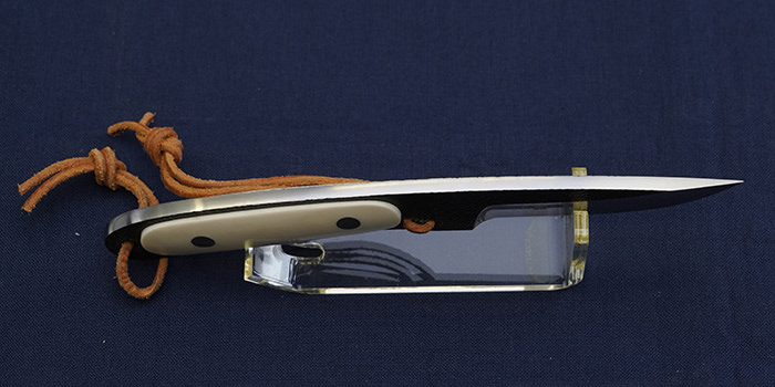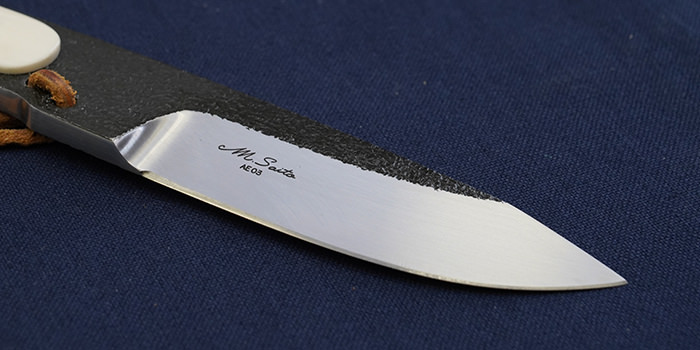 斉藤さんは自動車整備の仕事をした後ナイフの製作を手がけた。この見事な作品は両面に厳選された象牙(アイボリー)をはめている。裏面の裏スキ加工は抜群で象牙のビス止めはGOODです。手縫い革シースはハードで秀でている。これだけ立派なシースは現代では作り手は存在しない。
